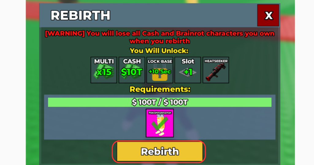 条件達成 → Rebirthボタン → 初期化内容確認 → 実行 の4ステップです
